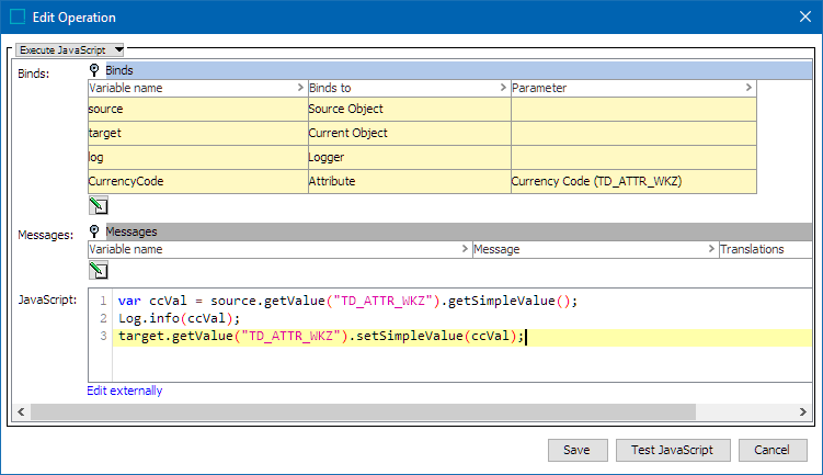 This sample code above expects a bind to the 'source' variable, gets the value of the 'TD_ATTR_WKZ' attribute on the source object, and stores it in the variable 'ccVal'.