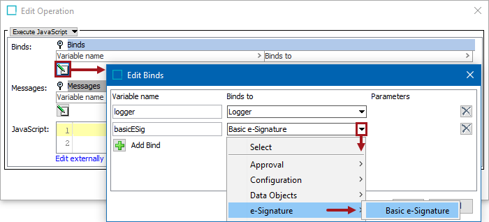 In the Edit Operation dialog, add JavaScript to call the bind.
