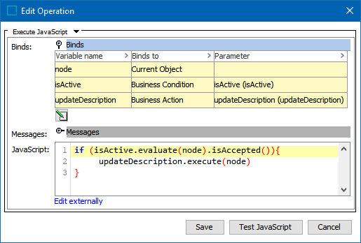 In the Edit Operation dialog, optionally add Messages, as defined in the Localized Messages for JavaScript Business Rules topic.