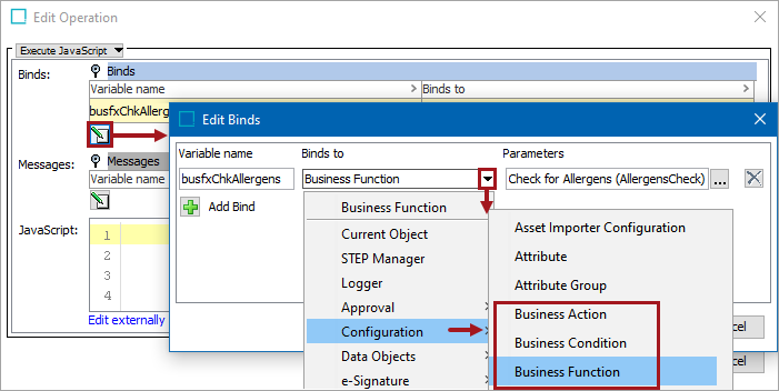 Within the Configuration group of the 'Binds to' field, business actions, business conditions, and business functions can be called by JavaScript business rules. Use the 'Parameters' field to select the desired action, condition, or function.