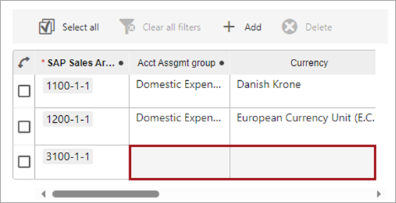 Hidden columns will not be visible in the data container table. In the following example, the ‘Currency’ attribute is displayed based on the value of the ‘Region’ attribute.