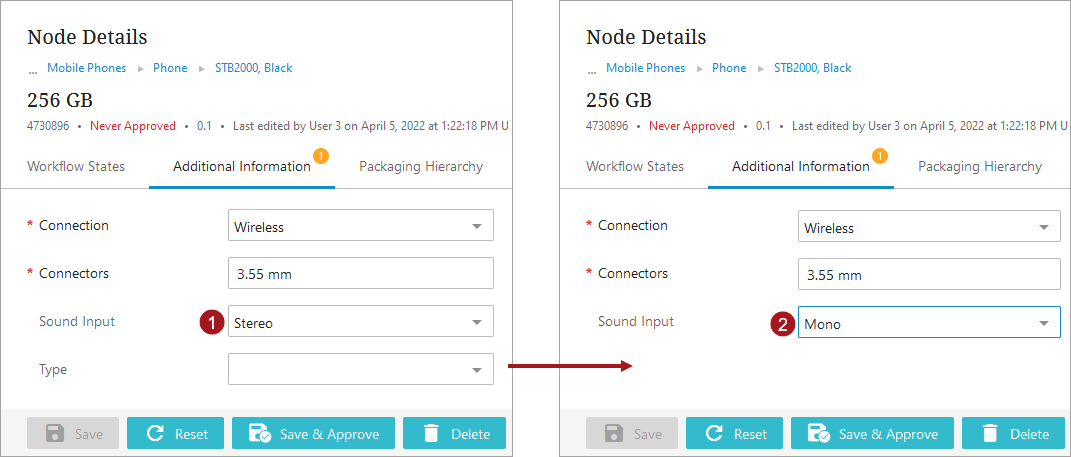In this example, one attribute displays based on the value in another attribute. The business condition running for the Node Editor screen verifies if the value of the attribute 'SoundInput' is 'Mono,' then the attribute 'PrintType' (with the Web UI label 'Type') is hidden from the user. If any value other than 'Mono' is entered in this field, the 'PrintType' attribute is visible.