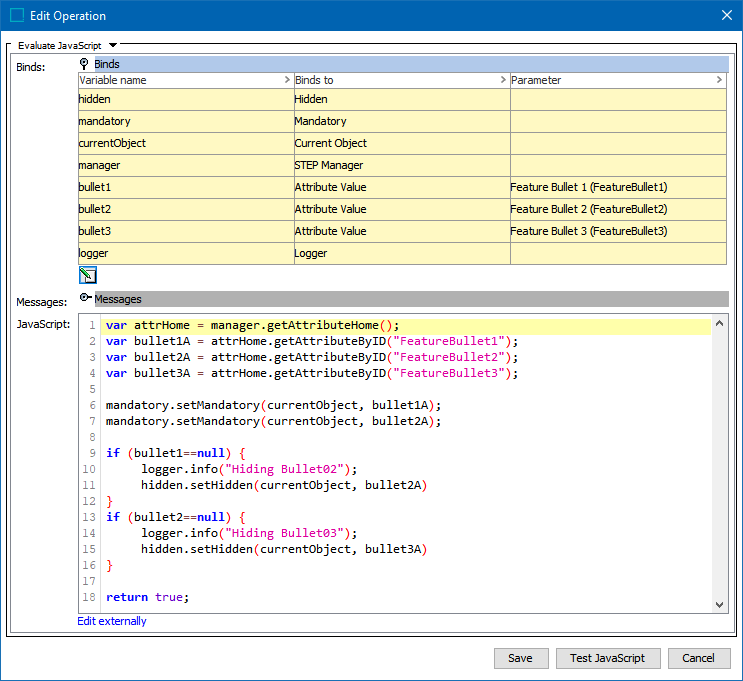 In the Edit Operation dialog, optionally add Messages, as defined in the Localized Messages for JavaScript Business Rules topic.