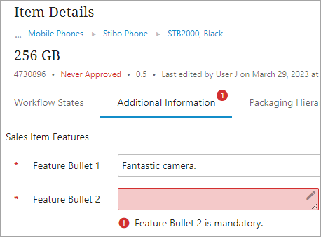 In the Web UI Node Editor image below, the Feature Bullet 1 attribute is displayed and shown to be mandatory. Notice that although Feature Bullet 2 is also mandatory, it is not displayed until Feature Bullet 1 has a value, but the error counter indicates that there are 2 errors because there are two mandatory attributes.