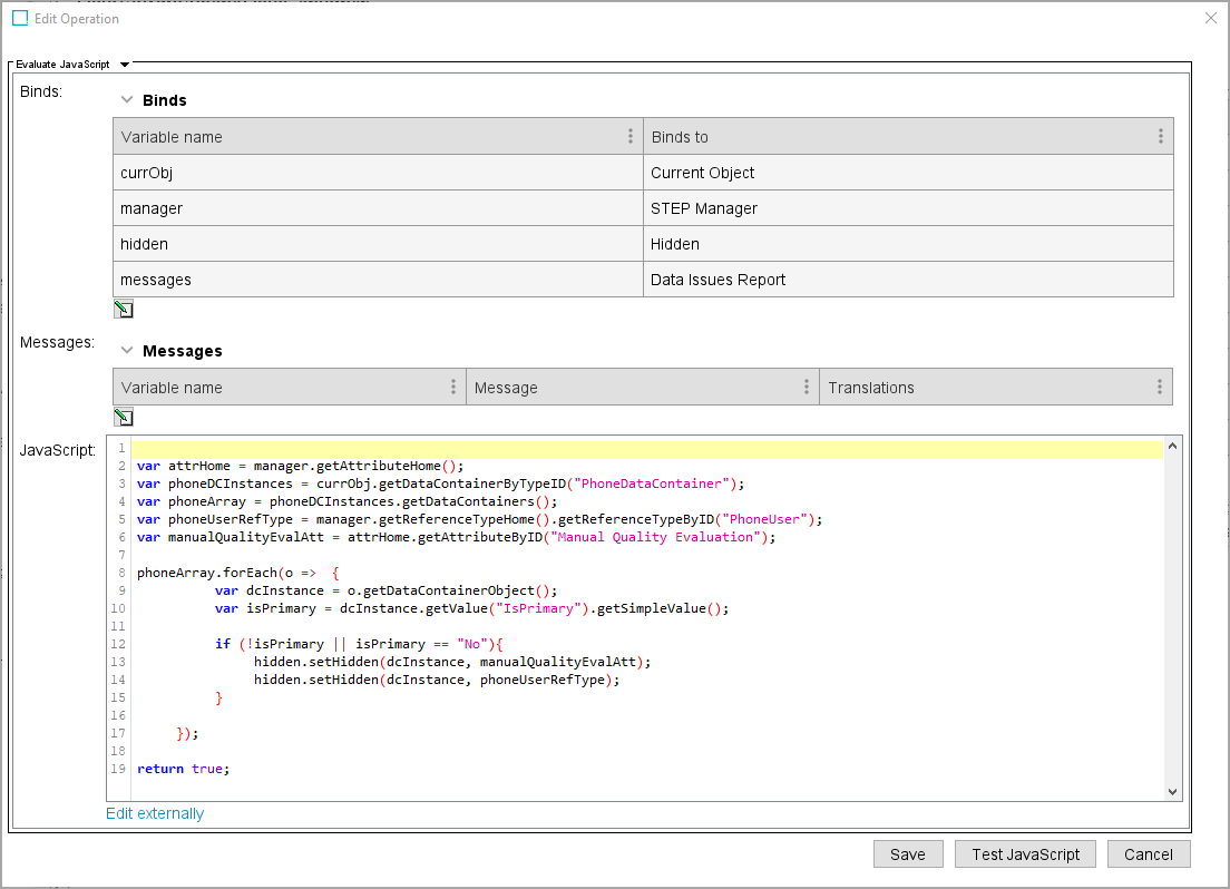 The Hidden bind facilitates the execution of a JavaScript-based business condition for attributes and globally configured references inside the Globally Configured Unfolding Data Container and the Globally Configured Multi Edit Data Container. This enables users to mark selected attributes and globally configured references as hidden within these data containers.