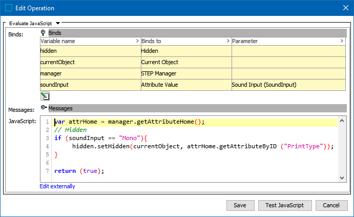 In the example JavaScript, the 'setHidden' method hides the 'Type(PrintType)' attribute if the 'SoundInput' attribute's value is set to 'Mono.'