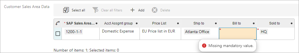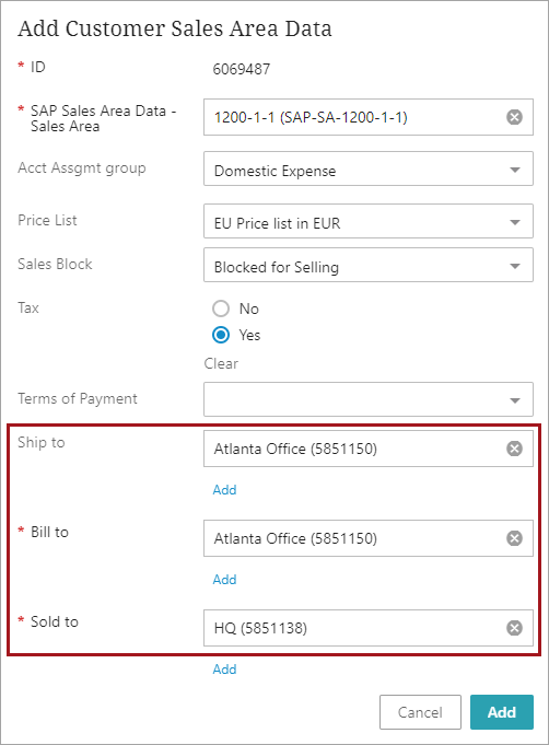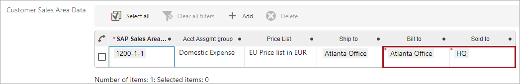 In this scenario, if the attribute ’Ship to’ is selected, values are required for the ’Bill to’ and ’Sold to’ references.