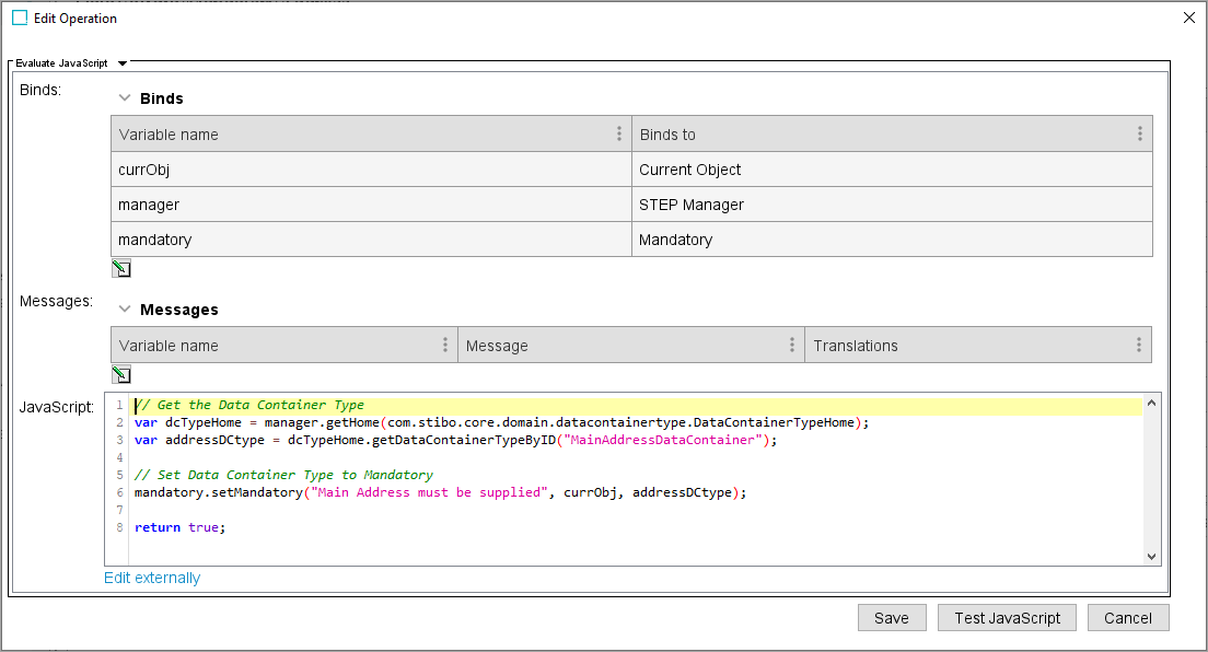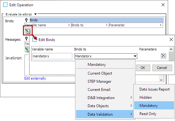 The Data Validation 'Mandatory' bind allows running a JavaScript-based business condition that sets selected attributes and references as mandatory in the Web UI. A message can also be displayed in the Web UI to give the user more information about why the object is mandatory.