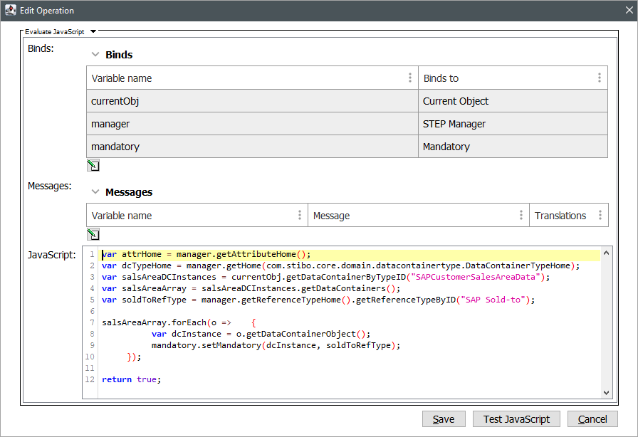 This example shows how the script sets a ‘SAP Sold-to’ reference as mandatory for each instance of the data container object type ‘SAPCustomerSalesAreaData’.