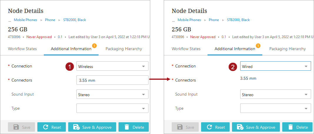A Node Details screen configured with a business condition to set the attribute 'Connectors' as read-only when the value of the attribute 'Connection' is 'Wired.' The end user can view the Connectors attribute and any values already entered, but cannot edit it. The bind can include a custom message if desired. No standard message is displayed for read-only.