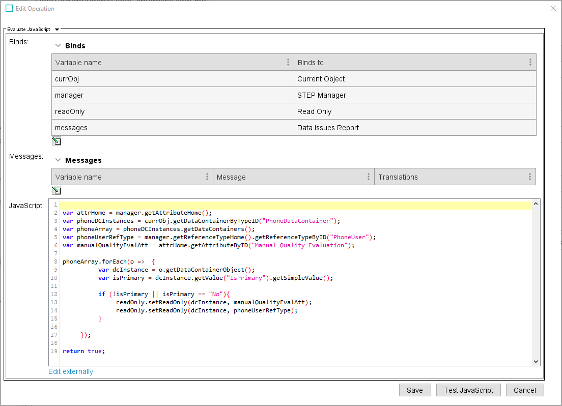 In the Edit Operation dialog, optionally add Messages, as defined in the Localized Messages for JavaScript Business Rules topic.