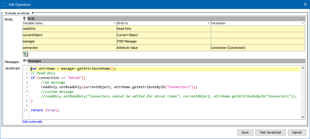 Add a custom message by including the message text (for example, 'Connectors cannot be edited for Wired items') as the first element within the setReadOnly method. The custom message is shown commented out on line 7 in the example JavaScript above.