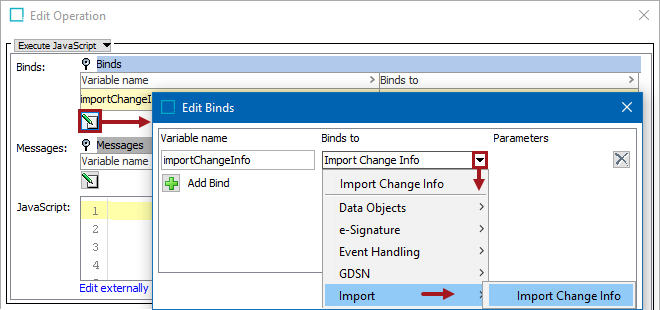 In the Edit Operation dialog, add JavaScript to call the bind.