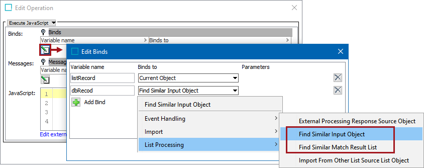 List processing configurations can use the Find Similar Input Object and the Find Similar Match Result List binds as defined below in JavaScript business rules identified by the List Processing Find Similar Configuration.