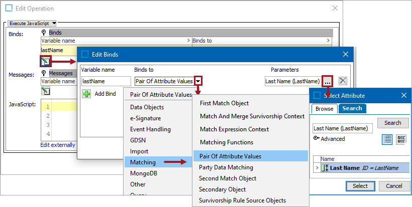 If a check of individual attributes between the source and golden records is required to determine when the source record data container should overwrite the golden record data container, the Pair of Attribute Variables bind can be created for each attribute to be compared.