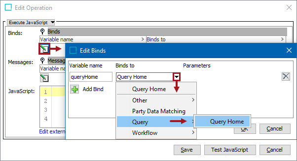 In the Edit Operation dialog, add JavaScript to call the bind.