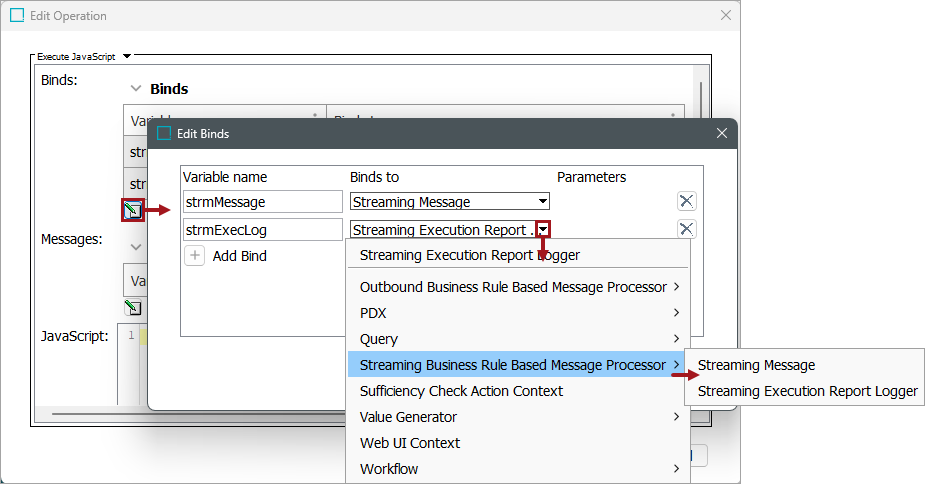 In the Edit Operation dialog, add JavaScript to call the bind.