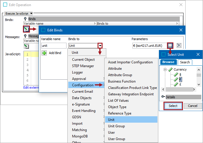 In the Edit Operation dialog, add JavaScript to call the bind.