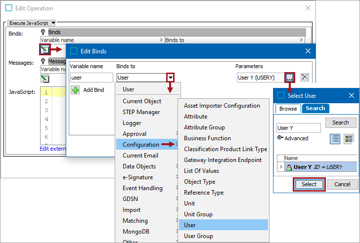In the Edit Operation dialog, add JavaScript to call the bind.