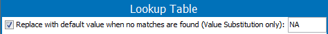 Using the 'Replace with default...' option on the Lookup Table set to NA as shown above, returns NA: