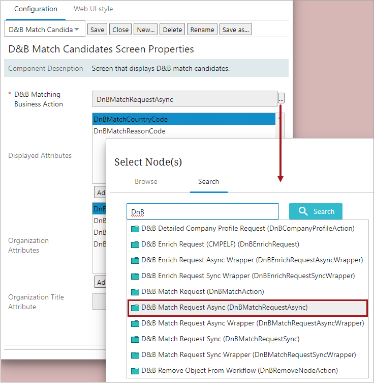 In Web UI designer, go to the Select Candidate Screen (for async processing), and set ‘D&B Matching Business Action’ to ‘D&B Match Request Async (DnBMatchRequestAsync)’