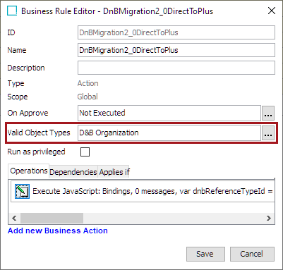 Apply migration scripts provided by Stibo Systems as a new 'Execute JavaScript' business action named 'D&B Direct 2.0 to Direct+ Data Migration'. (To receive these scripts, send an email request to dnbmigration@stibosystems.com using this subject: DnB Direct+ Migration Files Request).