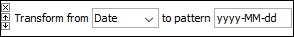 Transforms Date, ISO 'Date', or 'ISO Date and Time' attributes to a patterned format (e.g., yyyy.MM.dd G 'at' HH:mm:ss z, EE, MMM d, ''yy). You can use the prefilled pattern provided or manually enter (or cut and paste) a different pattern format. Validation Base Type for the attribute being exported must match the 'Transform from' dropdown choice. If exporting data to a pattern that includes a time zone, the time zone is determined by the STEP server location. Inbound transforms patterned dates (e.g., yyyy.MM.dd G 'at' HH:mm:ss z, EE, MMM d, ''yy) to Date, 'ISO Date', or 'ISO Date and Time'. Validation Base Type for the mapped attribute must match the 'Transform to' dropdown choice. Outbound transforms Date, 'ISO Date', or 'ISO Date and Time' attributes to a patterned format (e.g., yyyy.MM.dd G 'at' HH:mm:ss z, EE, MMM d, ''yy). You can use the prefilled pattern provided or manually enter (or cut and paste) a different pattern format. Validation Base Type for the attribute being exported must match the 'Transform from' dropdown choice. If exporting data to a pattern that includes a time zone, the time zone is determined by the STEP server location. For step-by-step instructions using this transformation, refer to the Transform Date by Locale or by Pattern topic of the Data Exchange documentation. |