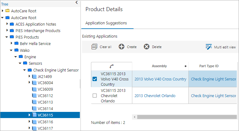 In the example below, part 'VC36115' is selected within the Web UI Tree, and an 'Applications Suggestions' tab is configured to display results for 'Existing Applications.' Within the results, two application records are displayed. An application record 'VC36115 2013 Volvo V40 Cross Country' is selected which activates and displays Delete () button thereby allowing users to remove that application record from the selected part.
