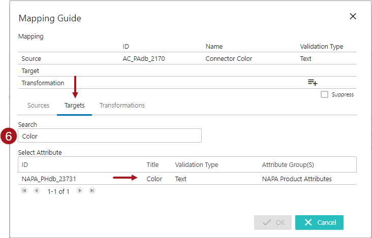 - With the Targets tab selected, click in the Search field and start typing the initial letters of the attribute name or ID. This searches for the attribute from the Target object where the retrieved value should be copied to. Select the attribute from the result list displayed below the search bar.