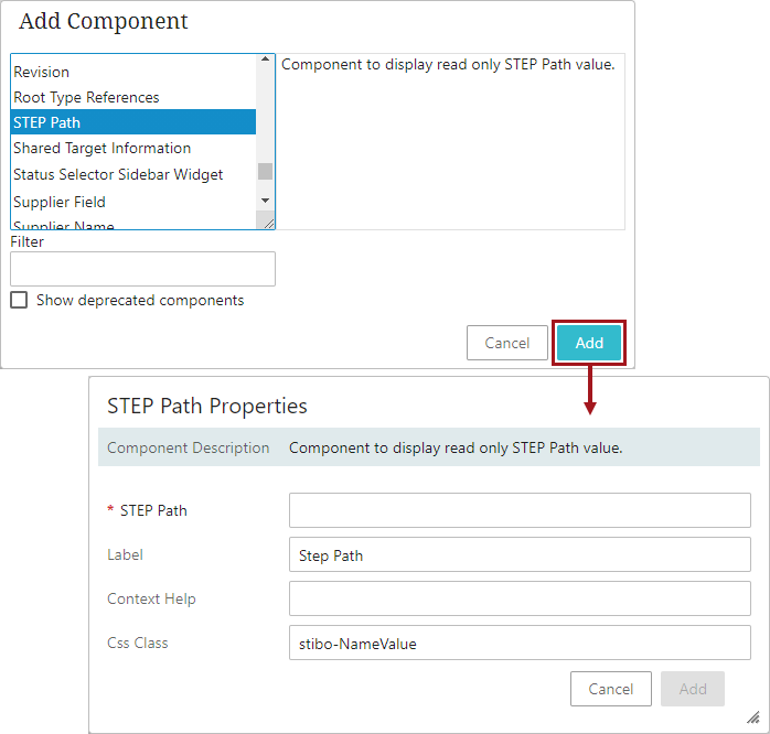 - Optionally, select the newly created STEP Path, and then use the Up and Down buttons to order the display of the newly added STEP Path component as desired.