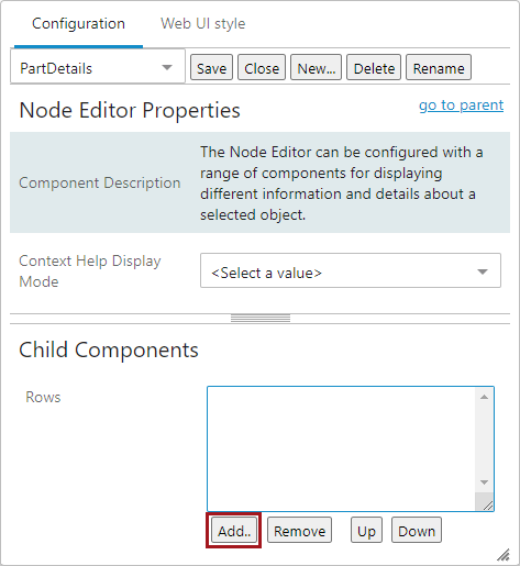 - In the designer, select your Node Details screen, navigate to your Node Editor component, and the Node Editor Properties will display. Click the Add button.