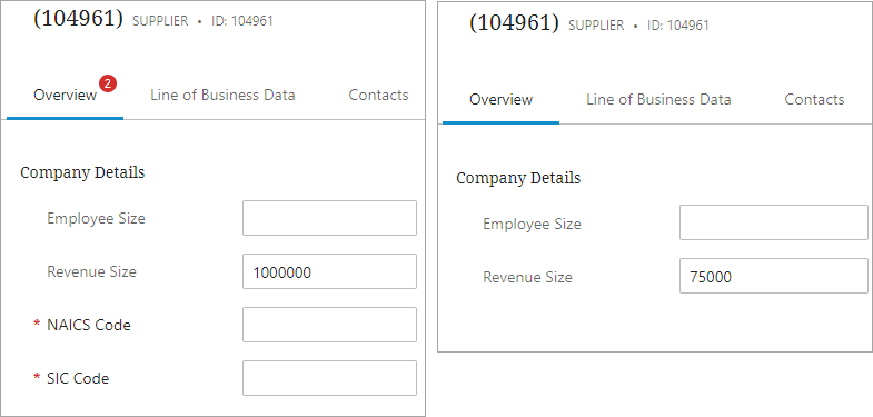 For suppliers, the Revenue Size attribute value determines the requirement for the NAICS Code and SIC Code attributes. This can be configured with the Hidden and Mandatory JavaScript binds.