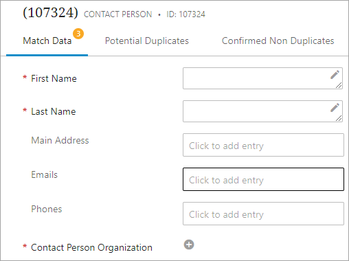 To improve data quality and ensure critical information is available, certain stewardship conditions may be built into the Web UI. Making the address, email, and phone attributes mandatory ensures that contacts are onboarded with the required information and without filler data.