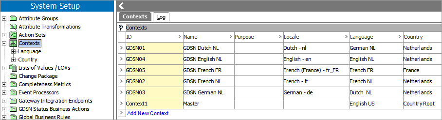 Note: When creating contexts, If more than four contexts are required, it is recommended to continue using the ID format GDSN01, GDSN02, etc., as shown in the image above.