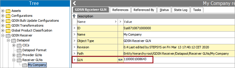 The GLN must be added to the GDSN Receiver GLN object. This GLN will be used for sending and receiving GDSN messages and must match the GLN that providers will use for publications.