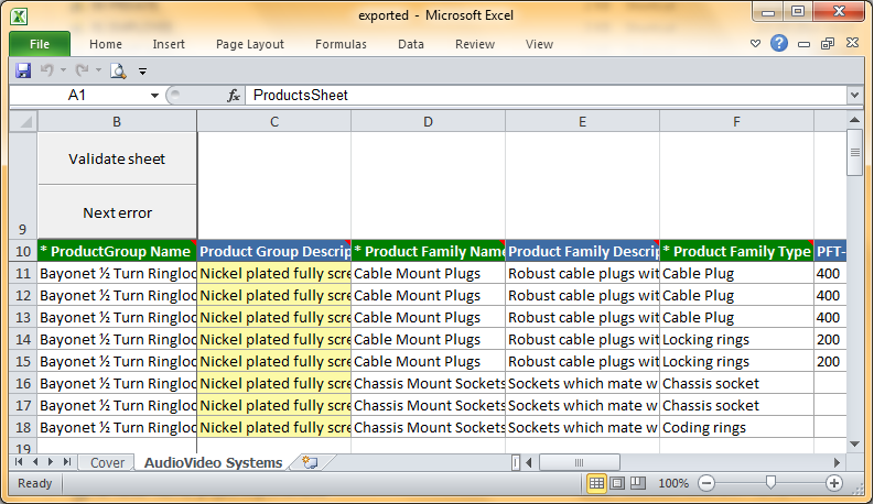 Note: If errors occur during an import, a Smartsheet file with the products that failed from the import process page can be downloaded. The error messages are displayed as screen tips in the Smartsheet file when the pointer is rested on an error cell. Next Error can be used to work a set of errors. When the errors have been corrected, the file can be imported again. However, there is limited support for this type of re-import. Some cells will be locked and consequently skipped during import.