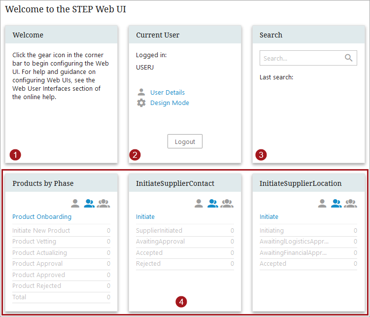 2. Current User - This widget shows the user currently logged into this Web UI and allows for the user to change details, enter the Design Mode, or log out.