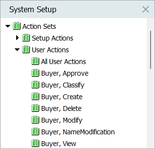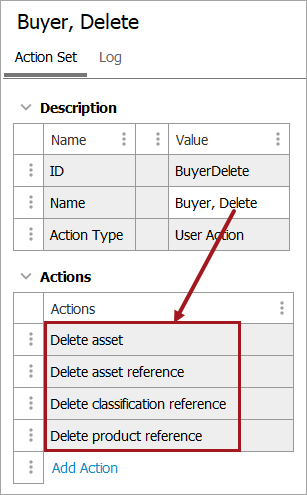 • Add all of the allowable actions of the chosen function (either 'Create,' 'Modify,' 'Delete,' or 'View') to the same action set. Since the object types are specified in each privilege rule, add the same actions for assets, products, and classifications to the same group. In the example below, the 'Delete,' action is being created for the Buyer role, and because privilege rules specify object type, a number of the various 'Delete' object types have been added.