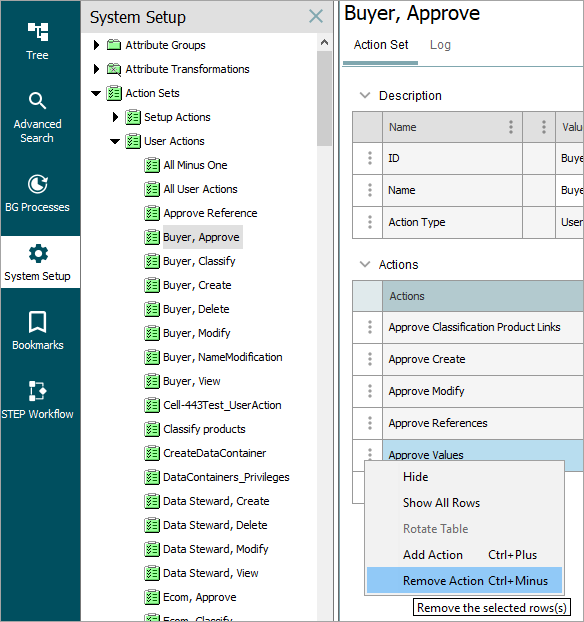 1. Under Actions, select the action to be removed from the Action Set.