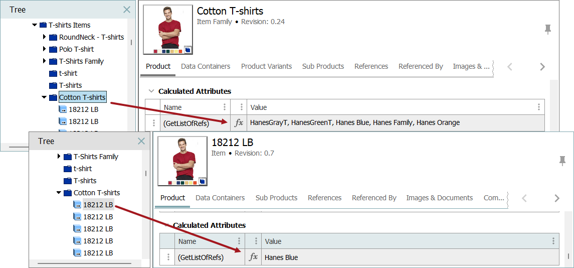 • Calculated specification attributes allow the formula ('Function') to inherit down to subordinate products. The calculation will always be performed at each subordinate level. Thus, calculated attribute values are not inherited, only the formula is inherited. For more information, refer to the Specification Attributes topic.