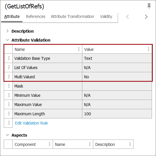 • Mandatory - Although an attribute with the parameter 'Calculated = Yes' can also have the parameter 'Mandatory = No', this is not advised. Since an actual value of a calculated attribute is not stored in the database (only the method to calculate the value), setting a calculated attribute to mandatory will prevent the attribute from being approved since it will never have a value.
