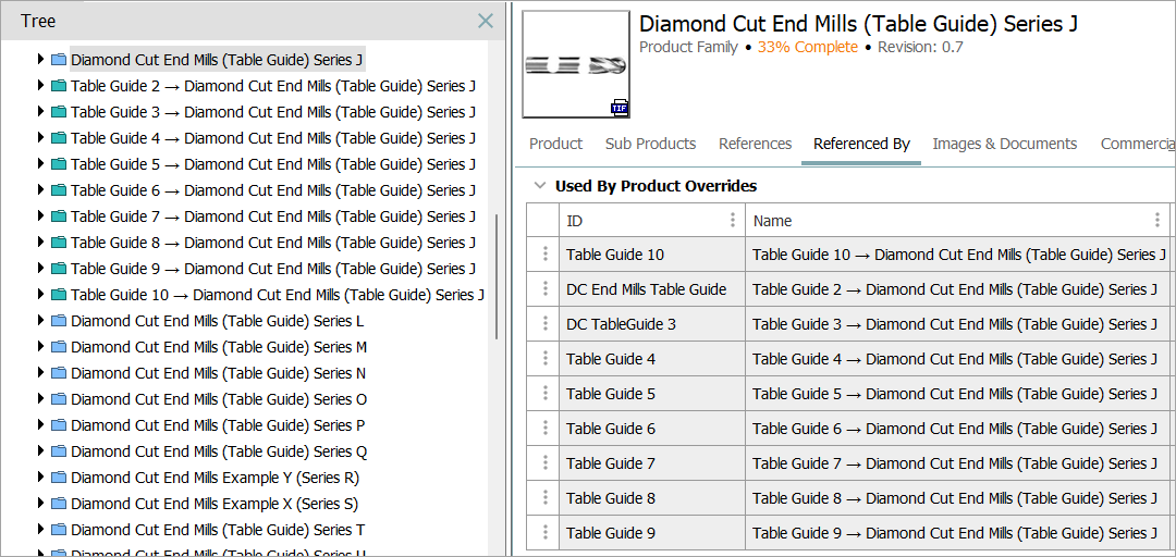 A calculated attribute can be used to display information about a product override on the originating product. In the screenshot below, the product 'Diamond Cut End Mills (Table Guide) Series J' has been overridden several times. The sections below describe how to use calculated attributes to display on the originating product the name of the overriding products, display on the overriding product the name of the overridden product, and display on the overriding product the IDs of parent products.
