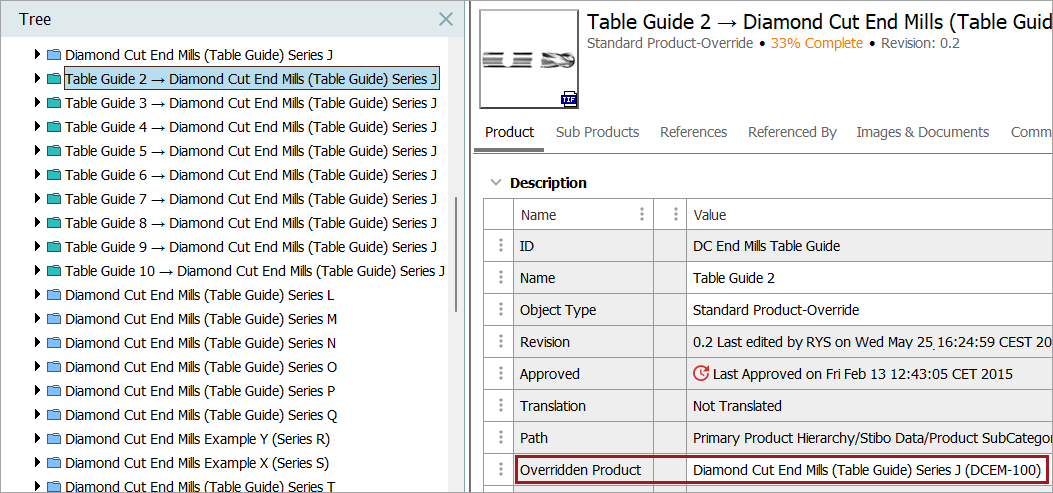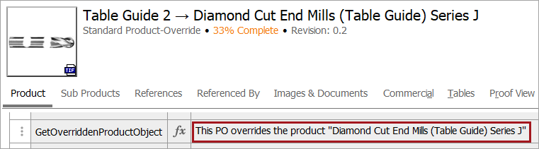 Select a product override object to display the Overridden Product attribute where the value is the name and ID of the product being overridden. In this example, 'Table Guide 2' has overridden the product 'Diamond Cut End Mills (Table Guide) Series J' with ID 'DCEM-100.'