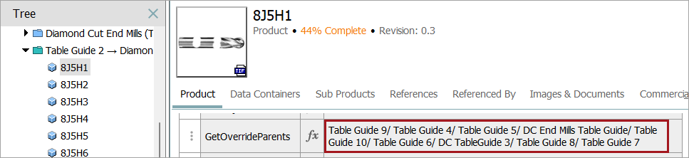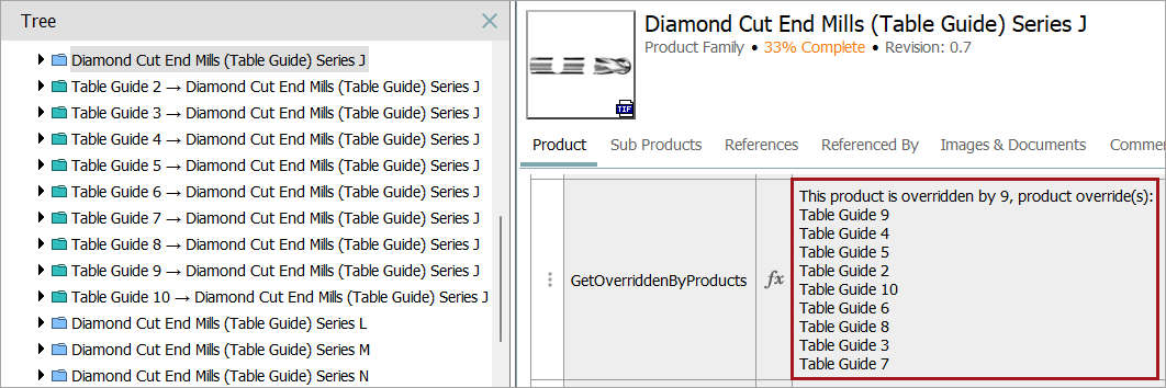 A calculated attribute on the originating product can list the names of the products that are overriding it. In this example, 'Diamond Cut End Mills (Table Guide) Series J' has multiple overrides.