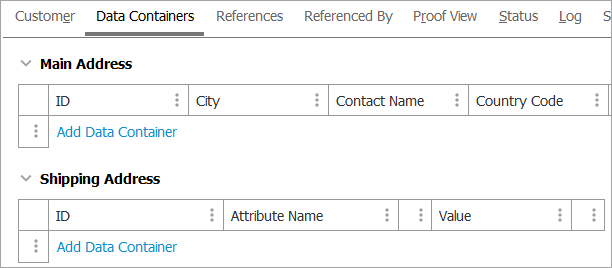 - If a data container type allows for multiple data containers as shown for 'Shipping Address' above, the Add Data Container link continues to display after the first data container is added.