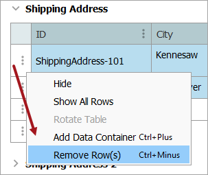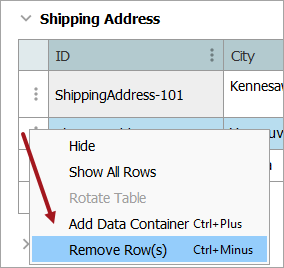 ) at the beginning of the data container row, press the Ctrl key on the keyboard, and continue to click the > button at the beginning of each row to be deleted. - Select the Remove Row(s) option.