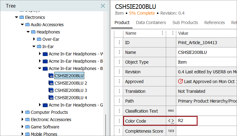 Description attributes are directly related to a specific object type such as product, classification, image, document, publication, and are automatically displayed in the Description field. There is no value inheritance to the nodes below.