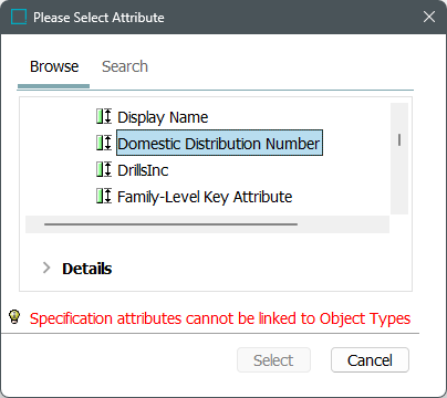 Note: The dialog shows both description and specification attributes. A message is displayed when a specification attribute is selected. The 'Select' option will be disabled for the specification attribute.