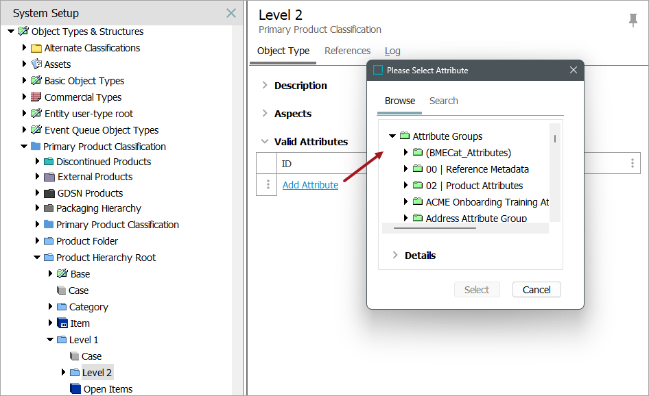 - Open the Valid attributes section and click the Add Attribute link to display the Select Attributes dialog.