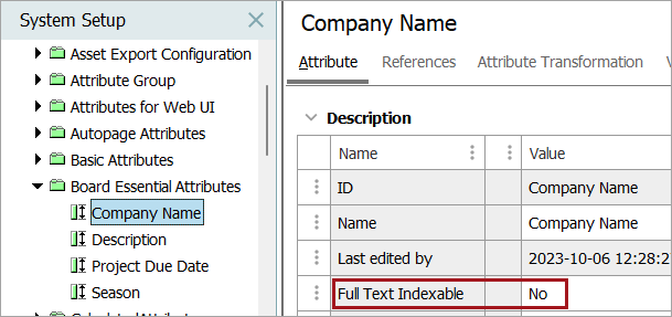 - In System Setup, expand Attribute Groups, expand the relevant Group, and then select the Attribute to be set as full text indexable.